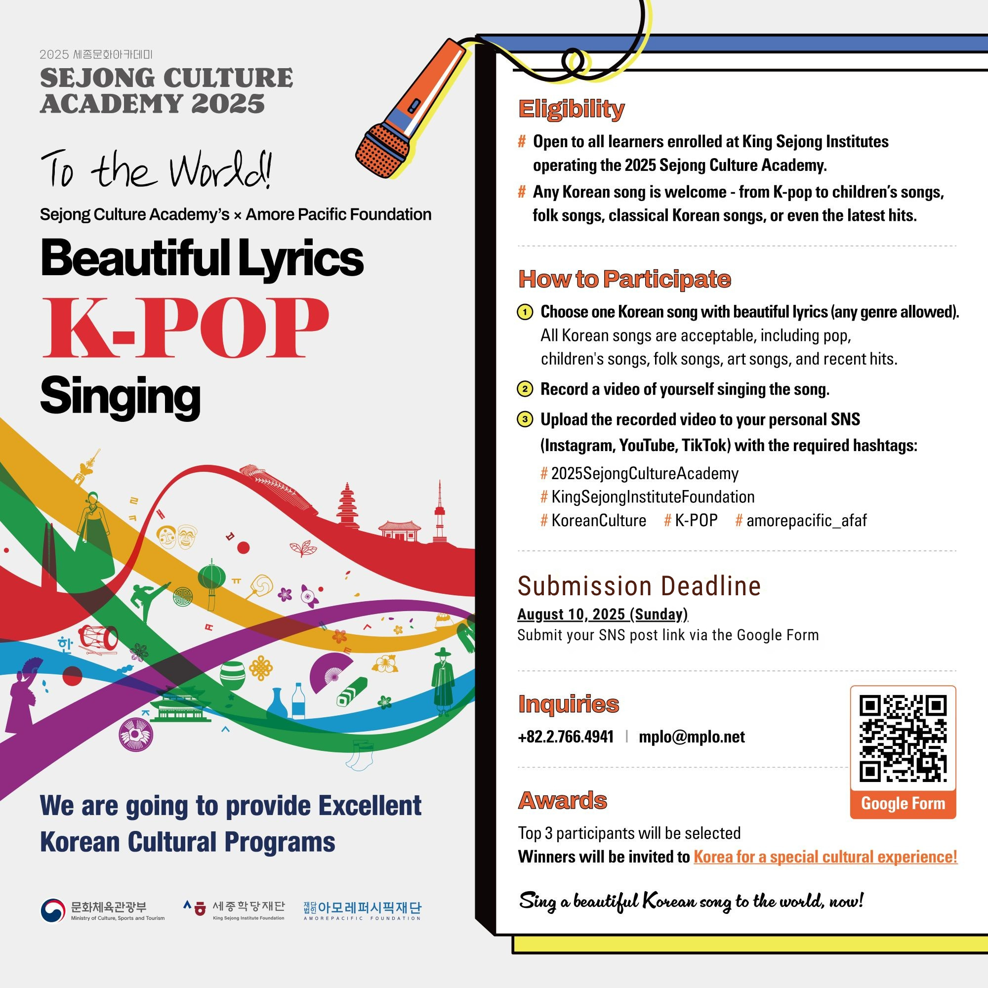 The King Sejong Institute Foundation and the Amorepacific Foundation are hosting a “K-POP Singing Contest – Beautiful Korean Lyrics” for students enrolled in the 2025 Sejong Culture Academy programs.